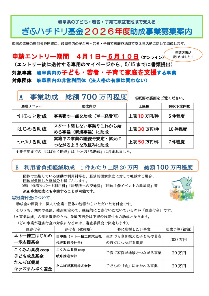 「ぎふハチドリ基金助成事業」は、市民から寄せられた寄付金を活用し、岐阜県内で、子ども・若者・子育て家庭を支援する事業に助成します。